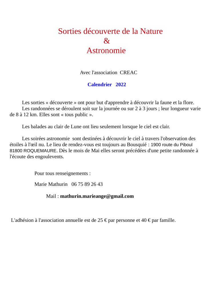 L’association CREAC vous invite à prendre connaissance du calendrier pour les nouvelles randonnées et sorties..