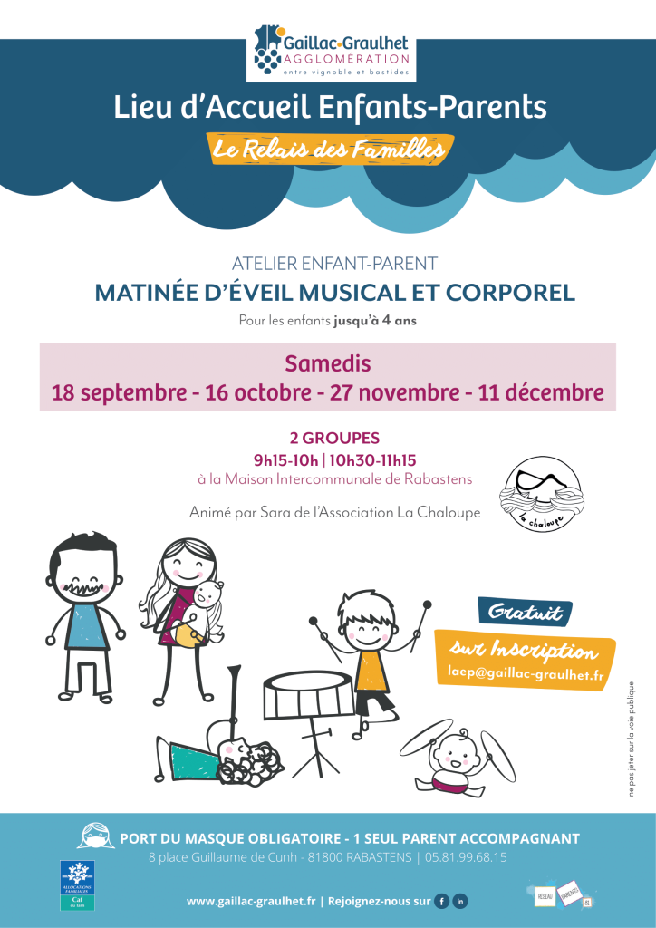 Le Lieu d’Accueil Enfants-Parents de la Communauté d’Agglomération Gaillac-Graulhet vous propose de participer à des Matinées d’éveil Musical et Corporel un samedi par mois ce trimestre.
