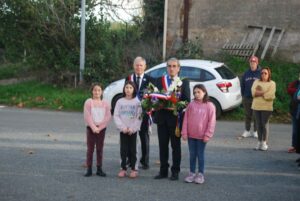 Monsieur le Maire et sa conseillère municipale ont présenté leurs hommages par la lecture d’un discours avant de procéder au dépôt de gerbes avec les enfants.