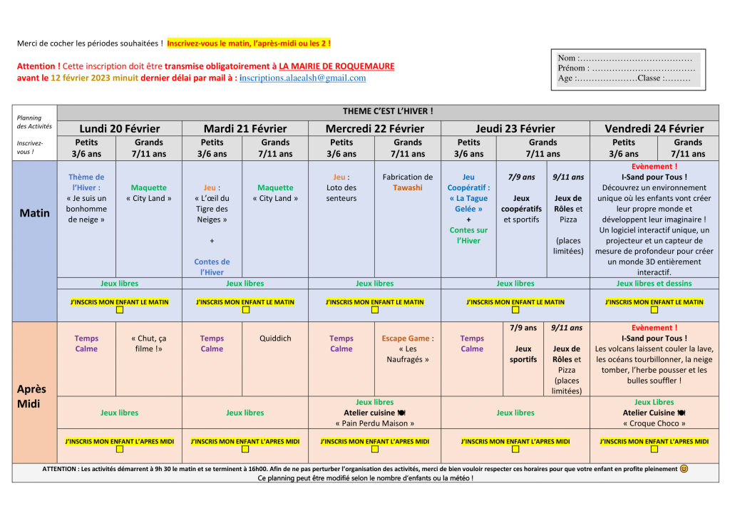 Fiche à télécharger en pdf : 1 – Fiche inscription ALSH Hiver 2023